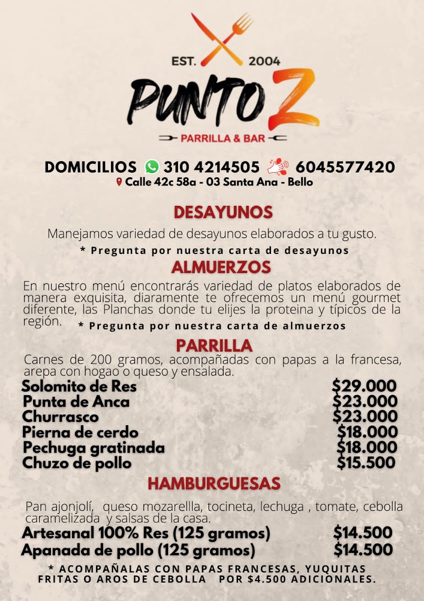 The menu at Punto Z Parrilla&Bar offers a delightful mix of local flavors and classic favorites, making it a great choice for any meal. One of the standout items is the Hamburger, which comes in a variety of preparations, ensuring there’s something for every taste. Known for its juicy, tender patty, the burger is paired with fresh toppings and served on a soft, toasted bun, making it a perfect comfort food option. Another notable mention is Ron Medellin, a local rum that adds an authentic touch to the drink selection. Whether you prefer your drinks neat or in a cocktail, Ron Medellin is a perfect match to the vibrant atmosphere of the restaurant.