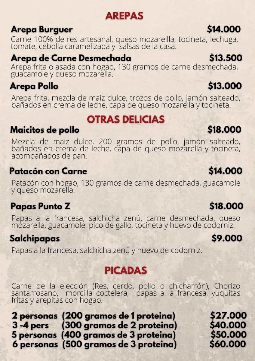 The menu at Punto Z Parrilla&Bar is designed to offer hearty and satisfying dishes, ideal for those who want to indulge in Colombian-inspired cuisine. The combination of flavorful dishes like the Hamburger with the local spirit Ron Medellin creates a balanced dining experience that reflects both the casual yet refined vibe of the restaurant.